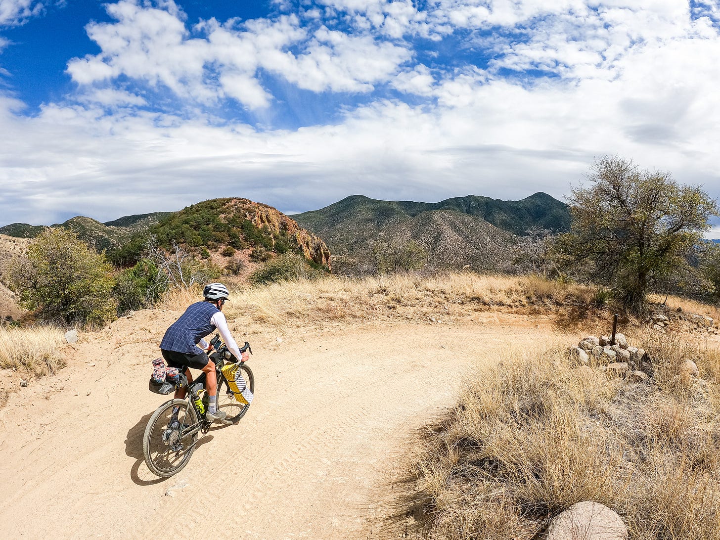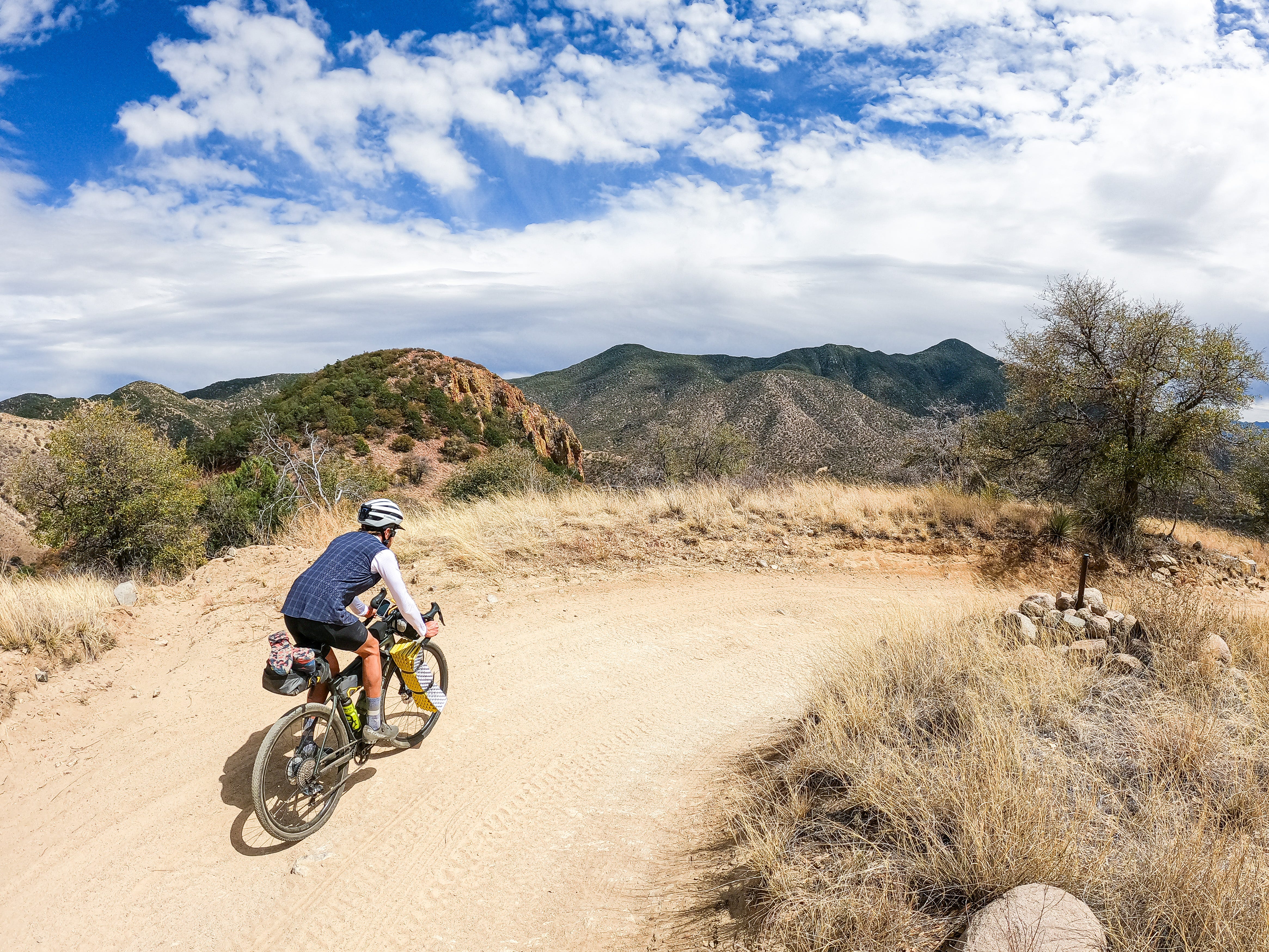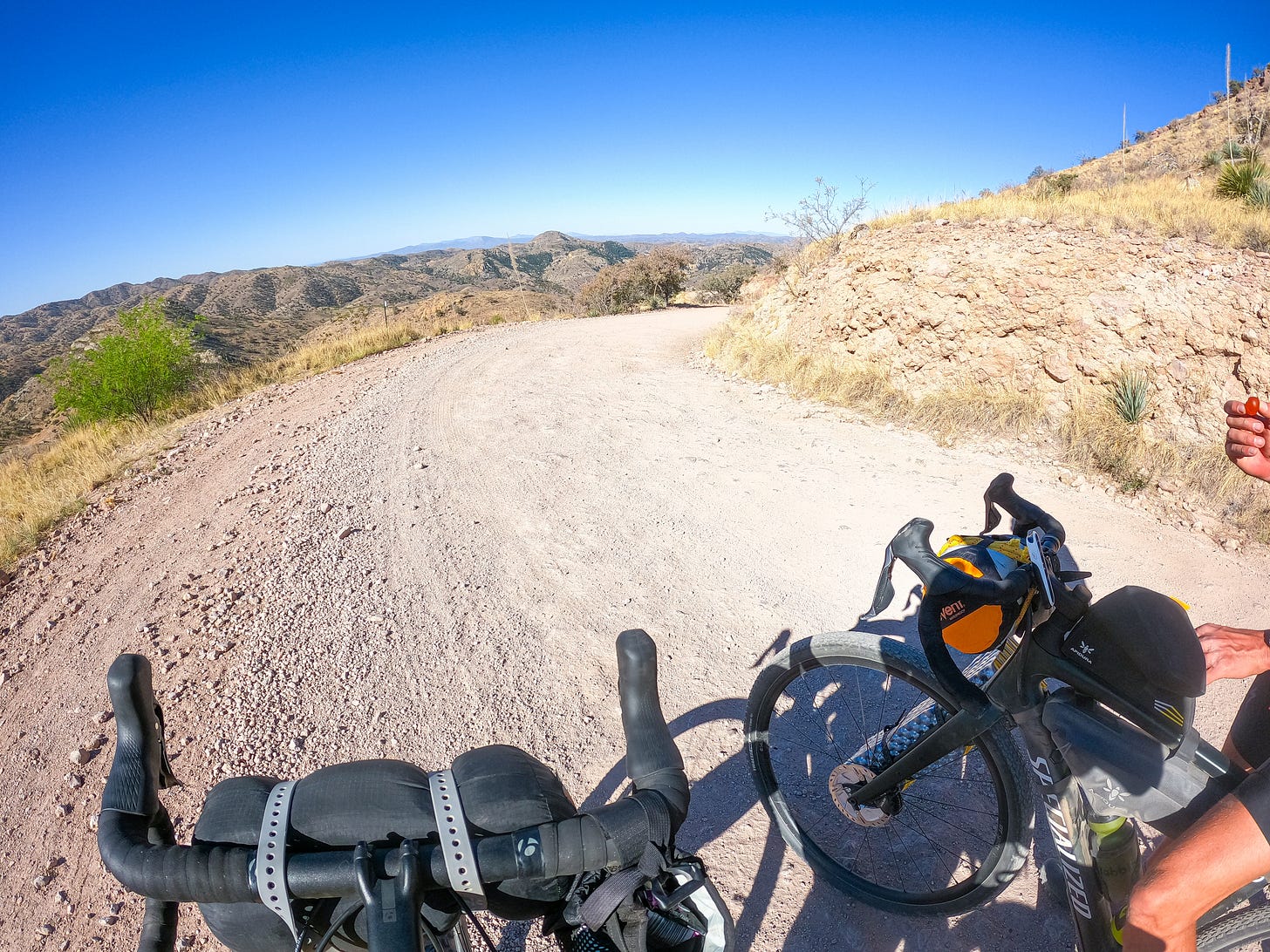 Overall the first day treated us well. Good pavement with little traffic, nice forest roads, and cloudy perfect skies. We cruised along and fiddled with various bags as our gear adjusted to the bumps and rocks. For the most part the day went smoothly. Some sections of old mining roads were definitely more suited for a mountain bike which required a bit of hike a bike but then a long solid descent to a Wendy’s in Rio Rico where we had some dinner.