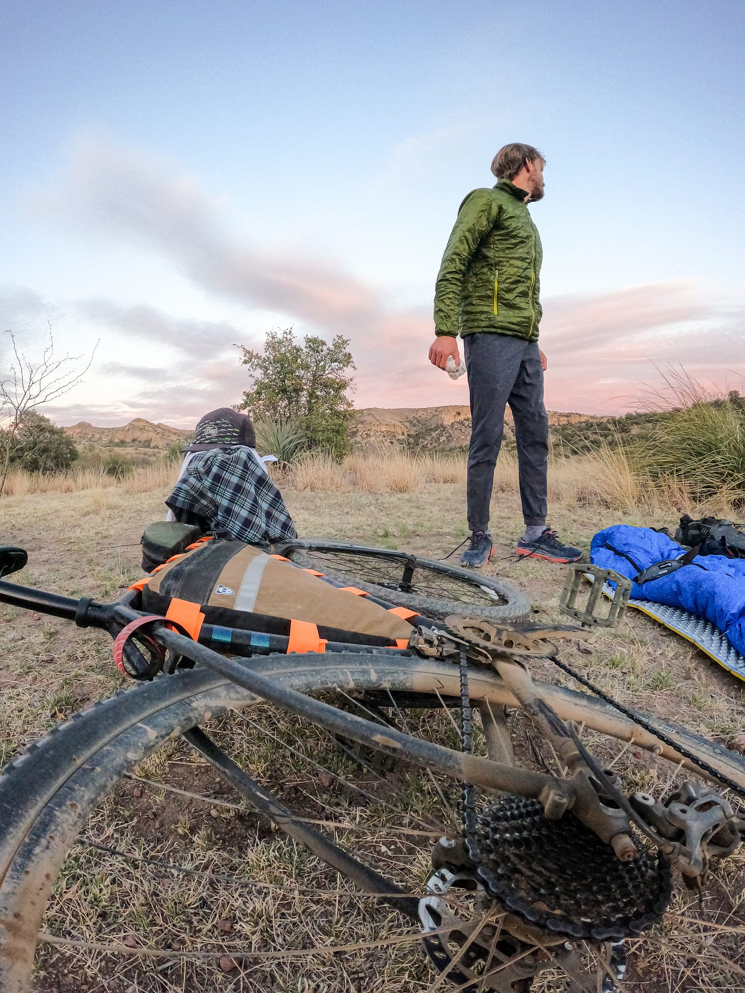 Dinner on bikes isn’t always glamourous. I ate chips, popcorn, Gatorade, and of course a mazapan. Hayden demolished a microwave burrito and some various snacks. Calories? Yes. Remotely healthy after 85 miles? No. As the sun set we rode a few more miles under headlamp and found another not so glamorous place to camp alongside a forest road. We set up camp in the dark and slept. 90 miles of rattly, smooth and and then rattly miles in the sun.